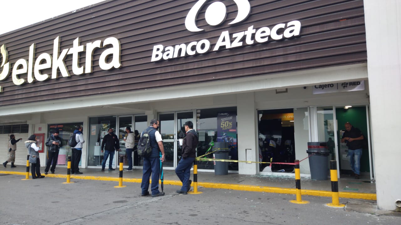 Vidrios rotos y presencia de elementos de la policía auxiliar, encontraron empleados de la sucursal Elektra en la que trabajan, esta mañana.