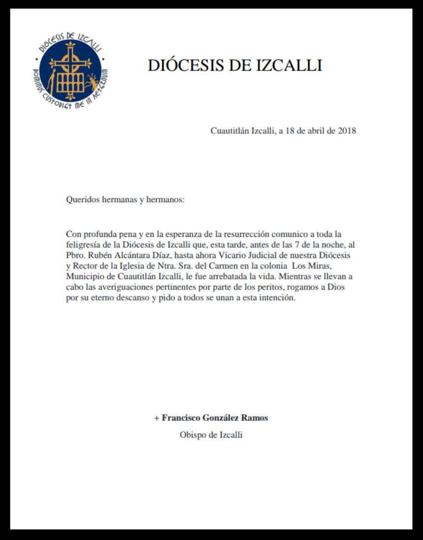 El Obispo de la Diócesis de Cuautitlan Izcalli, llamo a los feligreses a la oración , tras el asesinato del Presbítero Rubén Alcántara Diaz, la tardes de este miércoles, en este municipio.