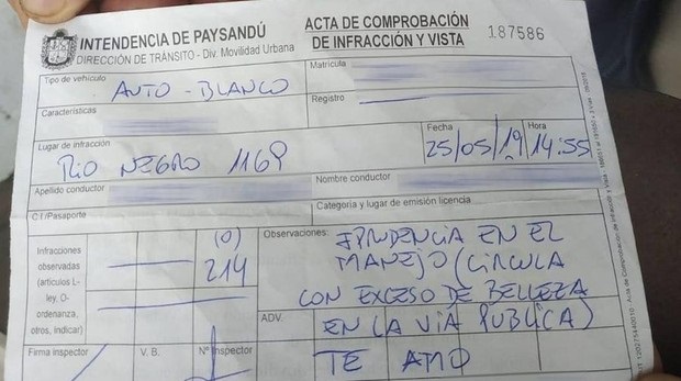 “Imprudencia en el manejo (circula con exceso de belleza en la vía pública). Te amo”, fue el texto que escribió el agente en la nota como motivo de la multa.