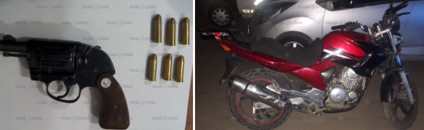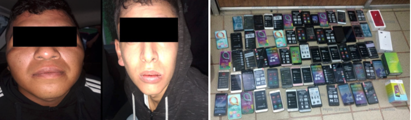 Los detenidos responden a los nombres de Héctor “N”, de 20 años de edad, y Brandon “N”, de 22 años, a quienes se les aseguraron una motocicleta Yamaha, 71 celulares de diferentes marcas y un arma de fuego tipo revolver calibre 38 con seis cartuchos útiles.