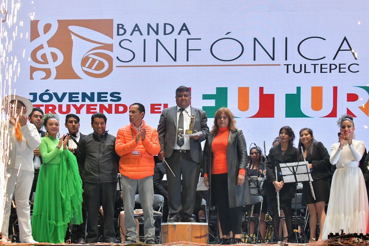 En el foro del Palacio Municipal, la Banda Sinfónica de Tultepec “Jóvenes Construyendo el Futuro” interpretó melodías de ayer y hoy en un escenario pleno de luces, fuegos artificiales y cuadros de danza folklórica del Grupo México Folclor de la Casa de Cultura de Tultepec.