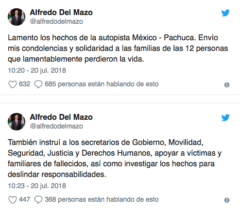 El gobernador de Estado de México, Alfredo del Mazo, ordenó que sean apoyadas las víctimas y familiares de los fallecidos por el choque de una combi contra un tráiler en la México-Pachuca.