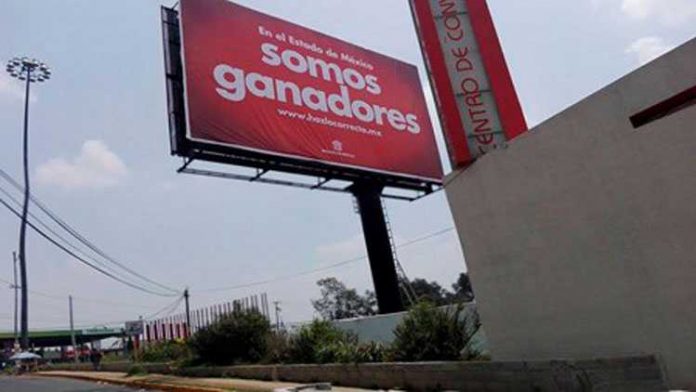 Los espectaculares con la frase, “En el Estado de México Somos Ganadores”, “Somos Fuertes”, “Somos Perseverantes”, entre otras, habían sido colocados en puntos estratégicos de la ciudad, con un fondo rojo con letras blancas, que aluden a dos de los tres colores de ese partido.