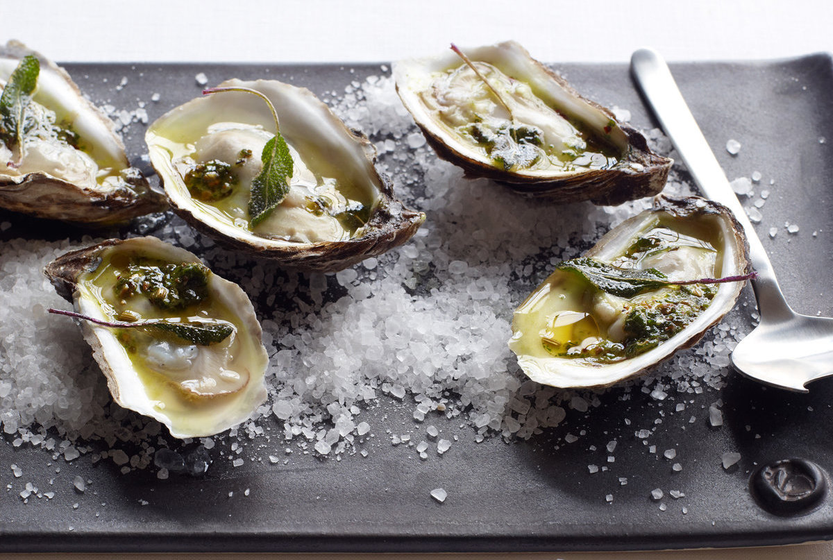 4 Enciende el asador. Cubre un plato con sal de grano. Asa los ostiones, con el lado más plano hacia arriba, a fuego alto hasta que se abran, de 1 a 2 minutos. Desecha el lado plano superior de la concha y coloca las ostras sobre la sal de grano, con cuidado de no tirar su líquido. Con una cuchara sirve la mantequilla de tequila sobre los ostiones, decora cada uno con una hoja de salvia crujiente y sirve.
