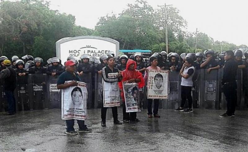 Madres y padres de los 43 normalistas de Ayotzinapa, desaparecidos en Guerrero, hace casi tres años, se manifestaron esta mañana afuera del hotel Moon Palace, en Cancún, donde se desarrolla la 47 Asamblea General de la Organización de Estados Americanos (OEA), lo que motivó la llegada de policías federales y locales para mantener el orden.