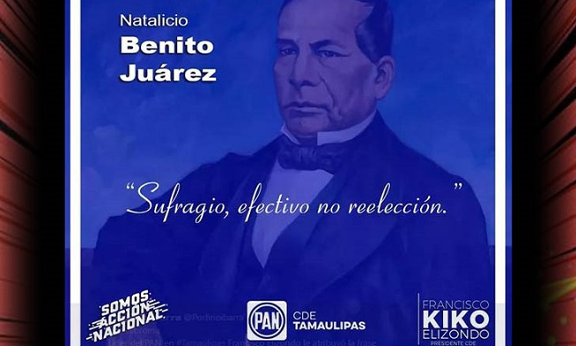 Y es que el líder estatal del Partido Acción Nacional en Tamaulipas, Francisco ”Kiko” Elizondo, compartió en sus redes sociales una imagen de Benito Juárez con un filtro azul (en referencia al PAN) con la frase ”Sufragio efectivo, no reelección”, la cual corresponde a Francisco I. Madero y no a Benito Juárez.