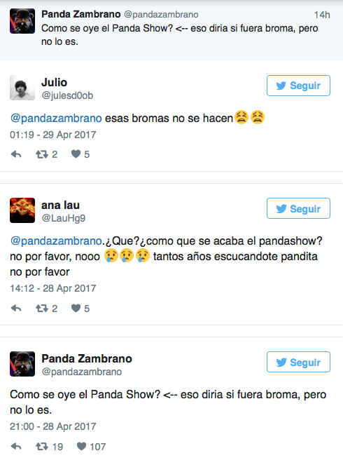 Antes de su despedida, un seguidor del programa acudió a las instalaciones de Grupo Fórmula ubicadas en la delegación Coyoacán para decir adiós a Zambrano, quien noche a noche, hizo reír y enfurecer a sus radioescuchas, así como a las personas que se comunicaron al llamado “Panda Cool Center”.