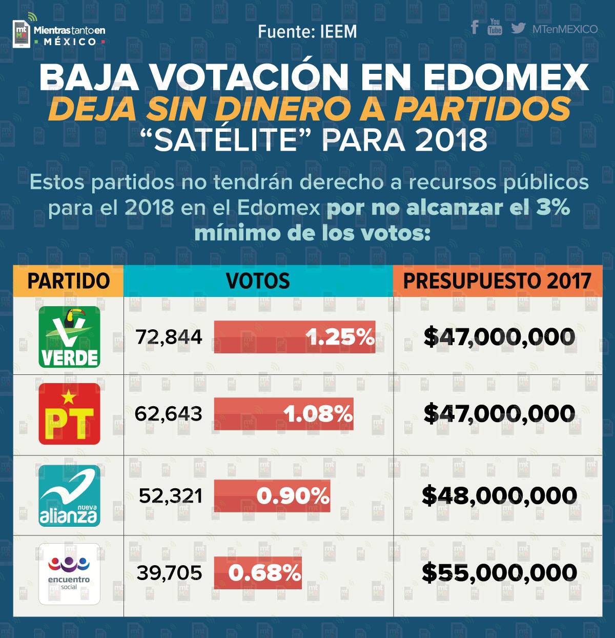 Debido a la baja preferencia electoral no gozarán del dinero público por parte del Instituto Electoral del Estado de México (IEEM), para competir en las elecciones de ayuntamientos y diputaciones locales que se celebrarán junto con las federales el 3 de junio del 2018.