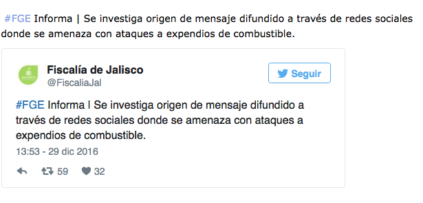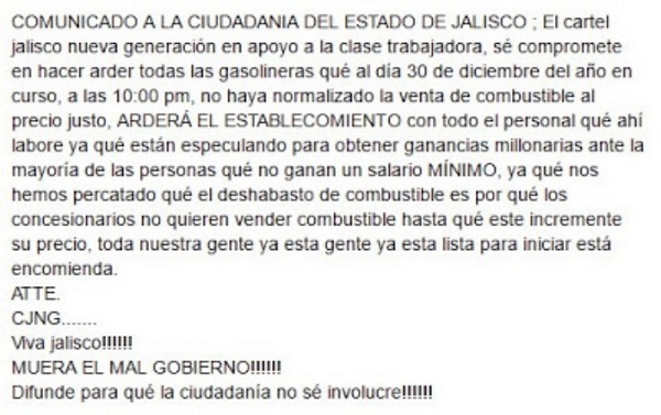 “El Cartel Jalisco Nueva Generación en apoyo a la clase trabajadora, se compromete en hacer arder todas las gasolineras que al día 30 de diciembre, a las 10:00 pm, no hayan normalizado la venta de combustible al precio justo”.