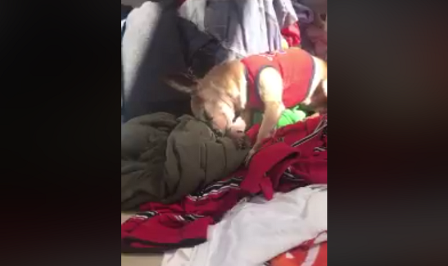 A través de redes sociales, una mujer compartió el momento en el que un perrito de raza Chihuahua llora sobre un montón de ropa, la cual pertenecía a su dueño fallecido.