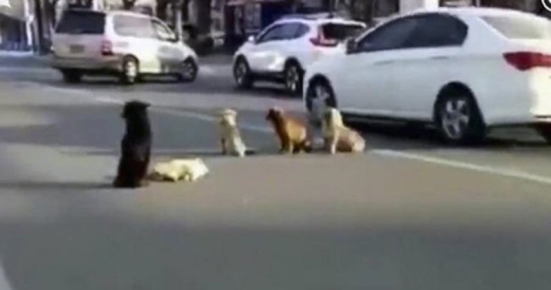 Un grupo de cuatro perros callejeros ha sido captado en video mientras ofrecen respetos a su compañero de manada, minutos después de haber fallecido arrollado por un conductor imprudente en calles de Lanzhou, China.