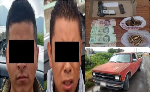 Asimismo, se informó que durante una revisión de rutina, a estos sujetos se les encontró una bolsa de plástico, en cuyo interior había 23 cartuchos calibre 32 milímetros, una pistola tipo escuadra de color negro, con un cargador abastecido con ocho cartuchos útiles del mismo calibre; una bolsa de plástico que contiene 30 gramos de hierba seca color verde con características propias de la marihuana y el dinero robado.