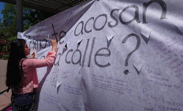 México.- “Un señor me chiflo”, “con la mirada”, “que te tomen fotografías”, dicen acusasiones escritas por mujeres sobre una manta en Guadalajara, Jalisco, que han sufrido acoso sexual en las calles.