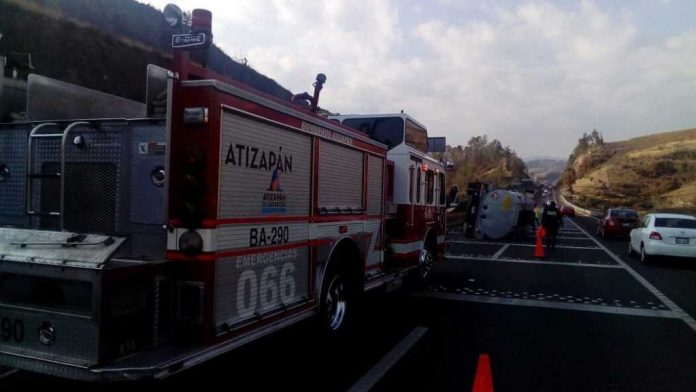 Reportes indican que el percance ocurrió esta mañana en el kilómetro 14.1 de la vialidad de cuota, en las inmediaciones de la presa Madín, en sentido hacia Chamapa, luego de que el conductor de la pipa perdió el control y el vehículo quedó de costado.