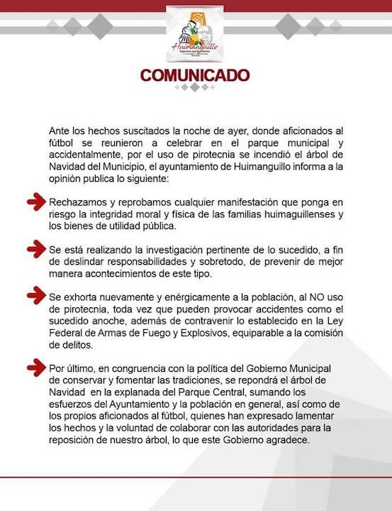 Luego de que aficionados del América incendiaran un árbol de Navidad durante los festejos por el título del Apertura 2018, el Ayuntamiento de Huimanguillo, en Tabasco, dio a conocer que repondrán el adorno navideño en aras de “conservar y fomentar las tradiciones”.