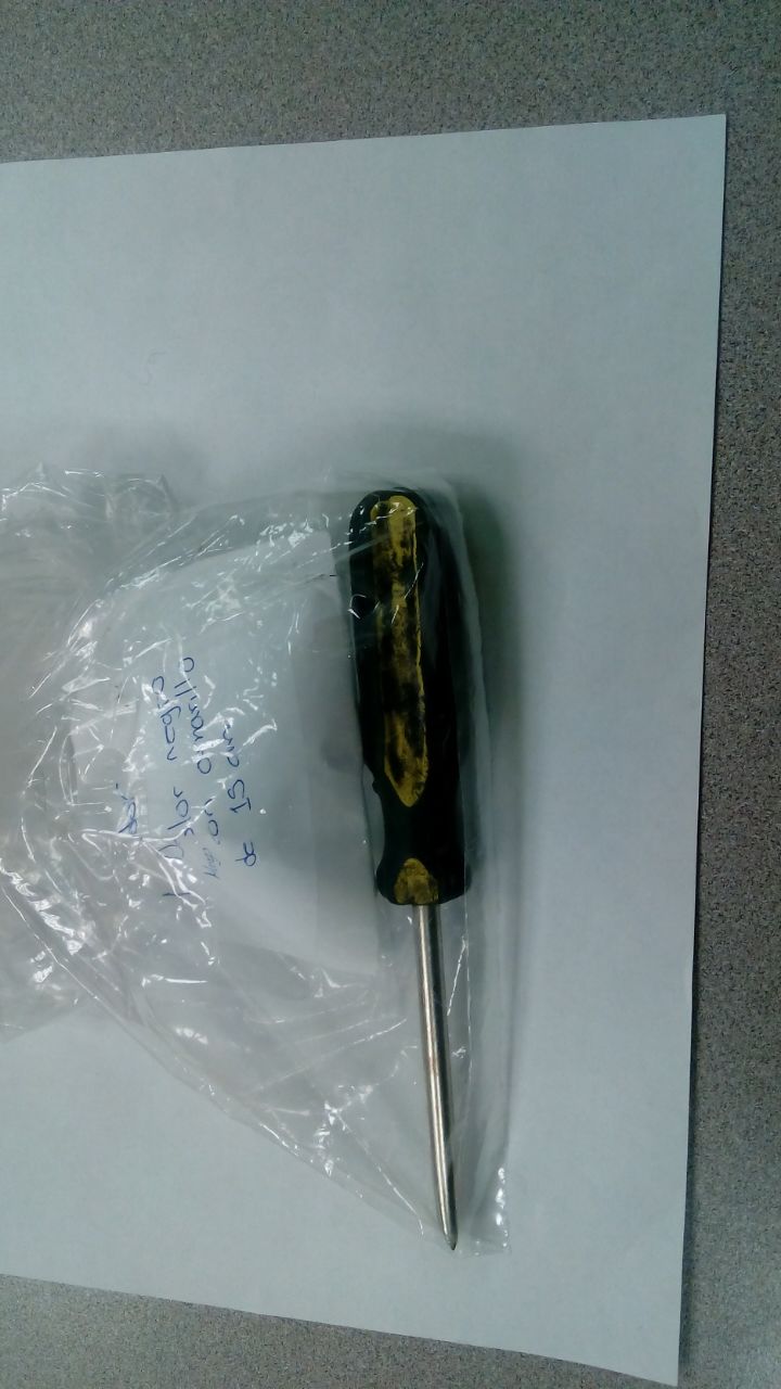 Tras someter y detener a esta persona, los uniformados en compañía del Jefe de Turno de Cuartel, procedieron a leerle sus derechos y realizaron una revisión de rutina, encontrándole a este sujeto en la parte trasera del pantalón un desarmador de aproximadamente 15 centímetros de largo de mango negro con amarillo con el que presuntamente actuó para cometer el hecho delictuoso en contra de los pasajeros.