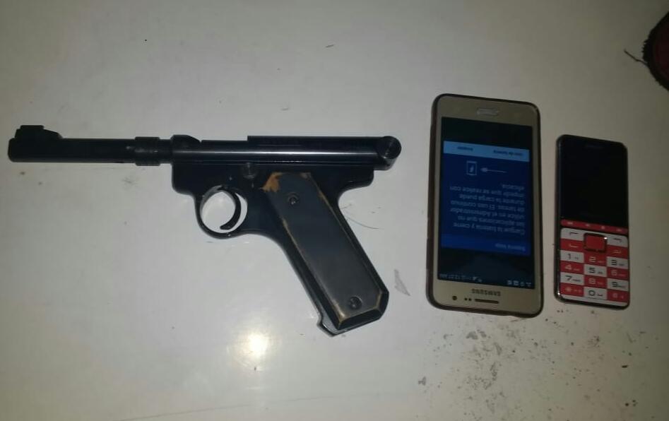 Tras hacer una revisión de sus pertenencias, los Policías encontraron en el interior del Automóvil una bolsa tipo mariconera conteniendo celulares de diversas marcas, así como una pistola de salva y munición color negra.