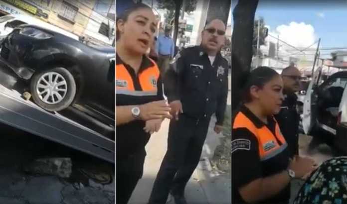Con el pretexto de que la unidad estaba arriba de la banqueta, oficiales pidieron el apoyo de una grúa que según ellos era concesionada y así remolcar la unidad al corralón.