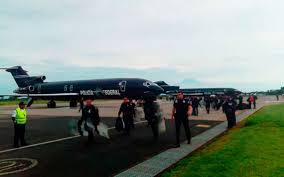 Se ve uno de los aviones en el aeropuerto de la ciudad chiapaneca, así como a los oficiales con sus maletas de viaje y escudo antimotines.