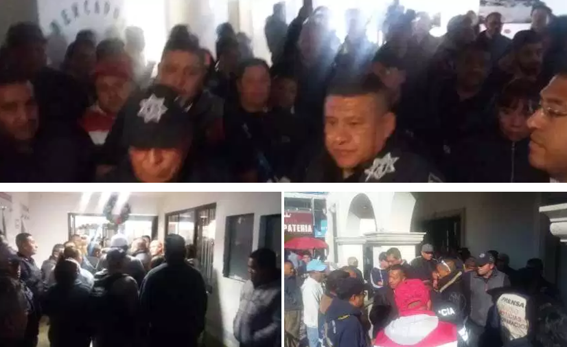 Desde temprana hora, un grupo de policías municipales se manifiestan afuera del ayuntamiento en contra de Simón Cedillo actual titular de Seguridad Pública de Los Reyes La Paz, quien fue impuesto por el exalcalde priísta Juan José Medina Cabrera.