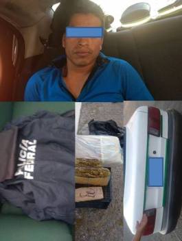 En tanto, en la colonia San Javier, al efectuarle una revisión a Reynaldo “N”, de 29 años de edad, elementos municipales se percatan que en el asiento trasero del vehículo Nissan Tsuru blanco que conducía, traía varios paquetes de hierba verde con las características de la mariguana, así como una chamarra de la Policía Federal.