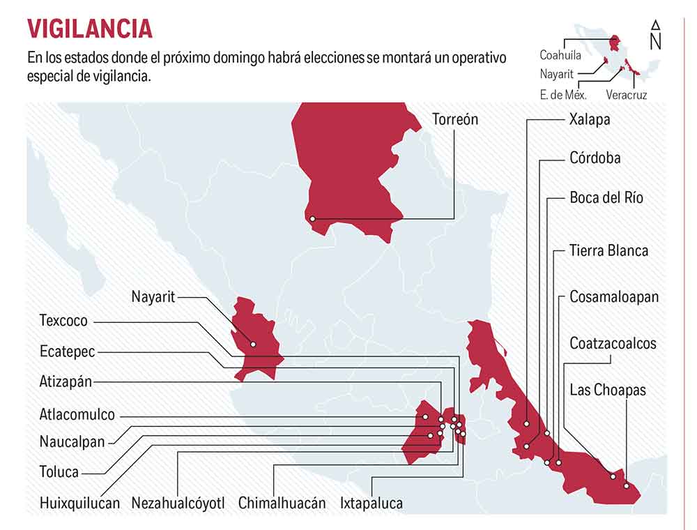 unos días de las elecciones en cuatro estados del país, el gobierno federal tiene listo un operativo para evitar incidentes, principalmente en el Estado de México, donde se desplegará un operativo especial en 11 municipios de la entidad, considerados como zonas de riesgo.
