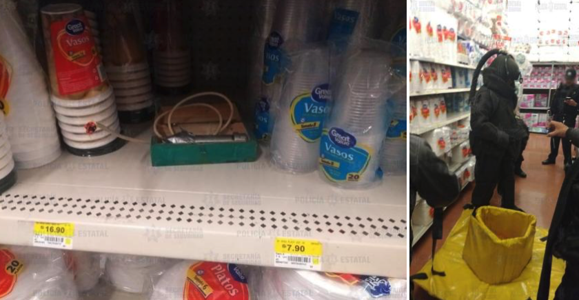 Personal dE la tienda Wal Mart ubicada avenida Central, en la colonia Rinconada de Aragón alertó al equipo antibombas debido a que un explosivo, aparentemente casero, fue colocado entre los anaqueles donde se ubican las materias primas, como el unicel.