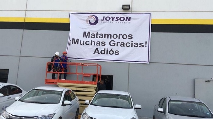 Joyson Safety Systems (JSS), empresa china que fabrica y desarrolla sistemas de seguridad para automóviles, anunció este viernes su salida de Matamoros con una manta que colocó en la entrada de la planta en esta ciudad, lo que afectará a 800 empleados.