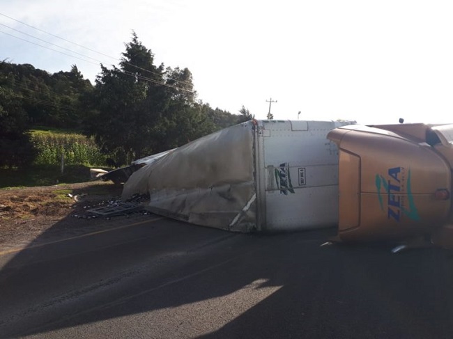 Un tractocamión volcó esta mañana sobre el kilómetro 248 en la autopista Orizaba-Puebla. El hecho se registró a las 06:30 horas, cuando el conductor perdió el control de la unidad que transportaba tablaroca y ocasionó que se saliera del camino y volcara sobre su lado derecho sobre el muro de contención, informó El Debate.