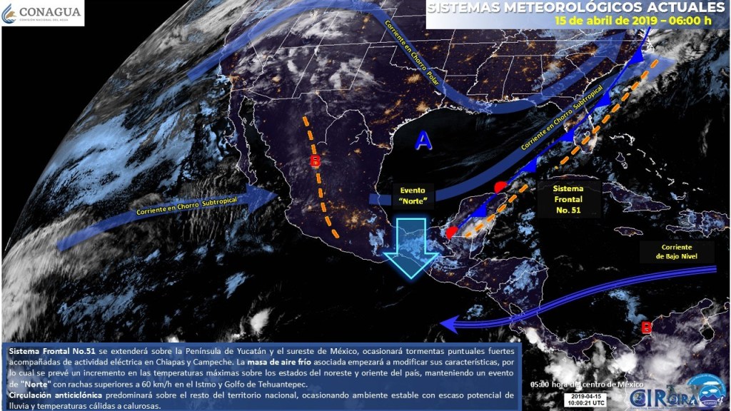 Para hoy, el frente No.51 se extenderá sobre la Península de Yucatán y el sureste de México, ocasionará tormentas puntuales fuertes acompañadas de actividad eléctrica en Chiapas y Campeche.