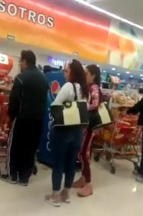 En redes sociales circula vídeo en el cual personal de prevención de un supermercado decide grabar a dos señoritas que se encontraban formadas en la caja y que dentro de sus bolsos traían varias botellas de vino, al momento que descubren que estaban siendo grabadas por este personal, se les mira nerviosas y deciden dar marcha atrás a su malévolo plan, regresando al pasillo de vinos y licores donde empezaron a dejar las botellas y diciendo que si no salían de la tienda con el producto no había problema a lo que el vigilante dijo que tenían que pagar, una vez que dejaron las botellas emprendieron huida dirigiéndose a la entrad principal donde se trato de detenerlas sin embargo no podía hacerlo ya que sobrpasaria sus atribuciones, por lo que el vigilante siguió grabando cosa que molesto a una de ellas y decidió golpearlo, a lo que dicho vigilante respondió diciendo “bien vestidas pero bien rateras””.