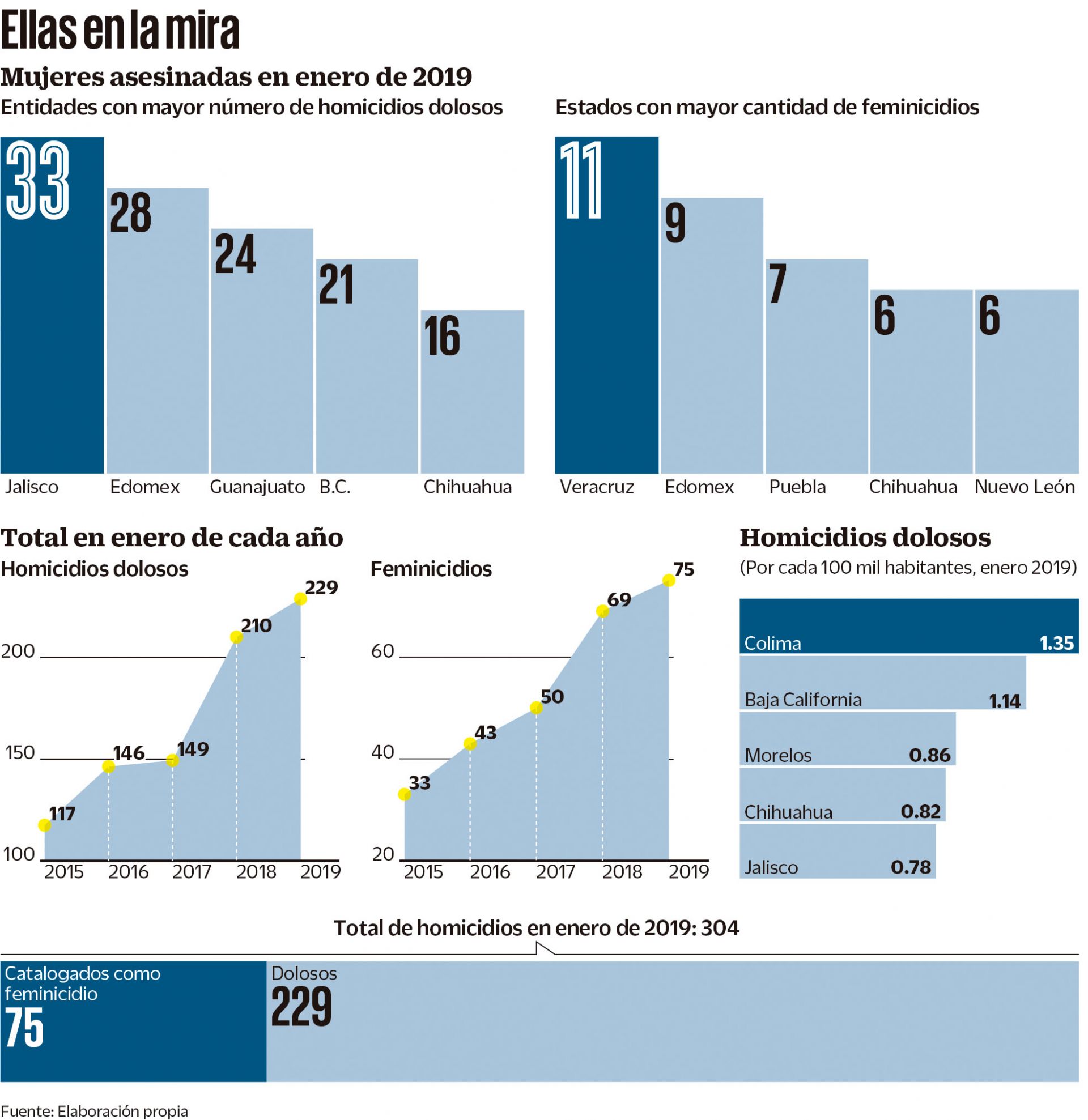 El reporte Información sobre violencia contra las mujeres muestra que en el primer mes de 2019 se registraron 304 asesinatos, de los cuales 229 están considerados como casos de homicidio doloso y sólo 75 se catalogaron como feminicidios.