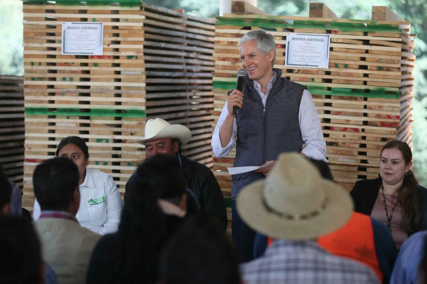 En su visita al Aserradero de los Bienes Comunales de Santiago Tlazala, en el municipio de Isidro Fabela, sostuvo un encuentro con líderes del sector forestal y con productores.