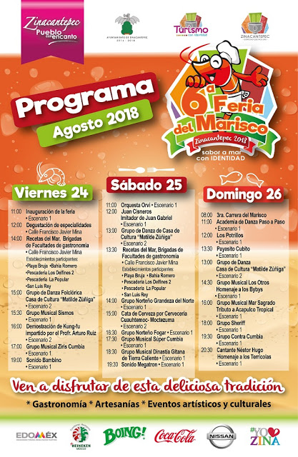 A partir del próximo 24 y hasta el 26 de agosto se llevará a cabo la Sexta Feria del Marisco Zinacantepec 2018 en el poblado de San Luis Mextepec.