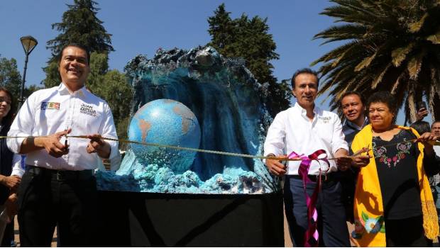 De gira por Metepec Zepeda inauguró una escultura de cartón, titulada La Ola Voraz, que representa un oleaje de desperdicios plásticos tratando de comerse al mundo.