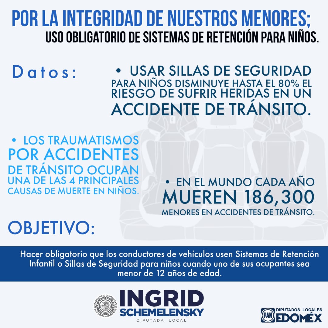 Durante la presentación de la iniciativa Ingrid Schemelensky, Diputada Local indicó que la propuesta tiene como objetivo volver obligatorio para todos los conductores de vehículos automotores, el uso de Sistemas de Retención Infantil o asientos de seguridad; cuando alguno de sus ocupantes sea un menor de doce años de edad o que por su constitución física lo requiera, deberá estar situado en el asiento trasero y será acorde a la talla y peso del menor.