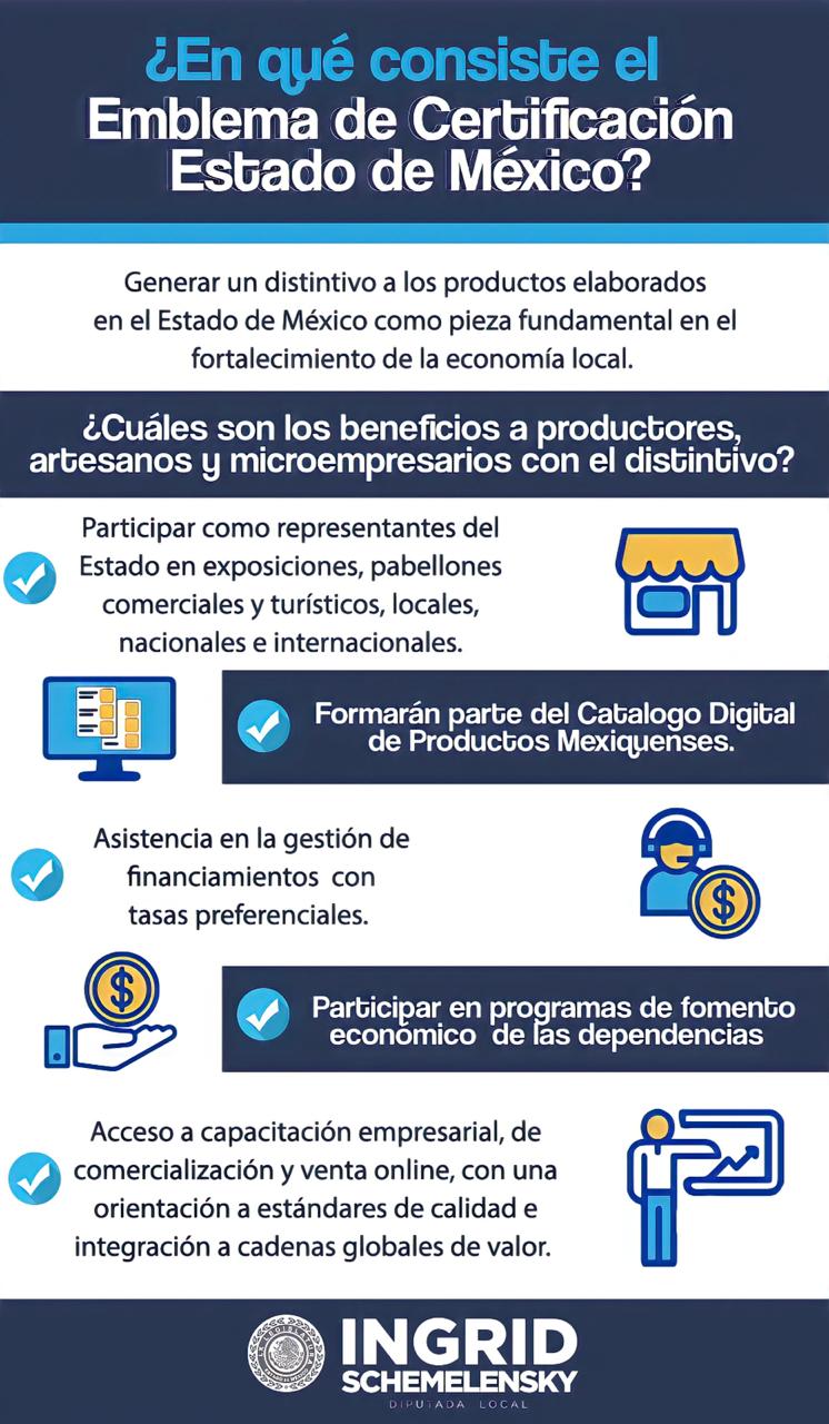 Durante la sesión deliberativa de la LX Legislatura Mexiquense, Ingrid Schemelensky, Diputada Local, propuso la creación del Emblema de Certificación Estado de México con el objetivo de fortalecer la economía local Mexiquense, promover el empleo e incentivar el consumo local a través de dos elementos principales.