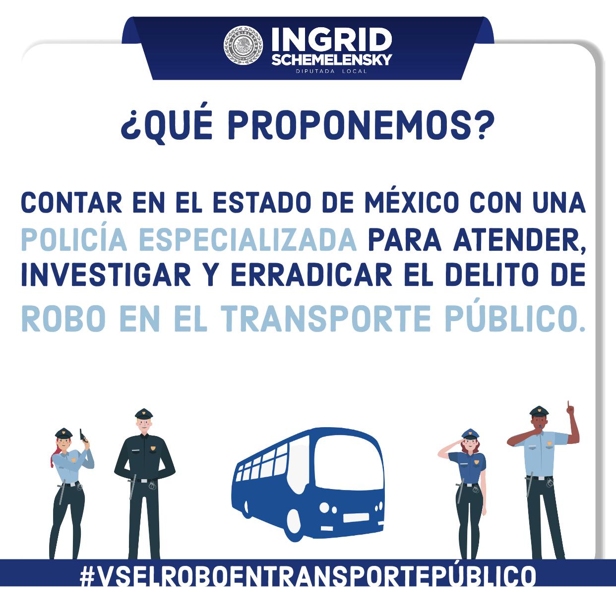 Durante la Sesión Legislativa del día de hoy, Ingrid Schemelensky, Diputada Local, propone que el Estado de México cuente con una policía especializada para atender, investigar y erradicar el robo en el transporte público, ante su aumento en los últimos años.
