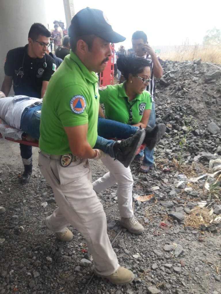 Arenas Herrera señaló que no habían terminado de atender a las mujeres, cuando les solicitaron el auxilio, en el puente del ramal 94 de la Magdalena, en donde una pareja de jóvenes de aproximadamente 25 años, salió volando del puente cayendo de una altura de seis metros hacia una zona de tezontle.