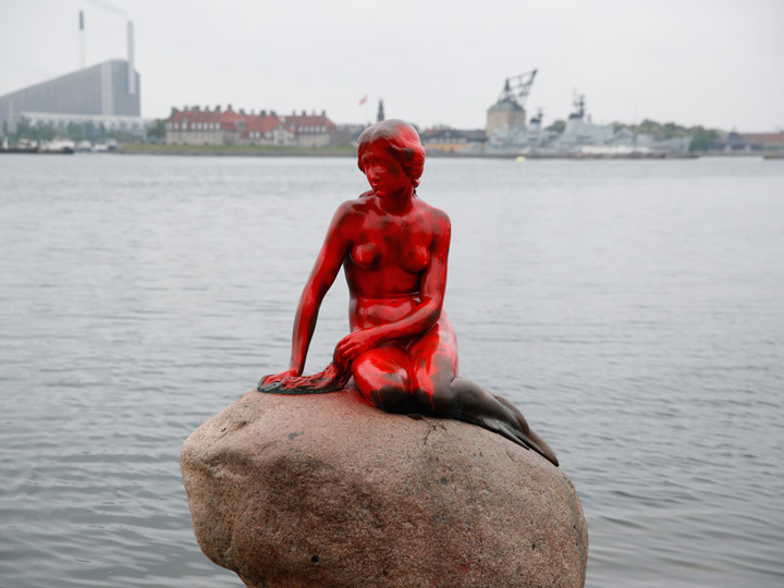 a famosa estatua de ‘La Sirenita’ en Copenhague, amaneció cubierta de pintura roja el martes como forma de protesta en contra de la cacería de ballenas que se practica en la región. En el suelo frente a la escultura apareció la leyenda en inglés “Dinamarca, defiende las ballenas de las Islas Faeroe”, una probable alusión a la cacería de ballenas piloto en las islas del Atlántico Norte durante el verano boreal, según la prensa danesa.