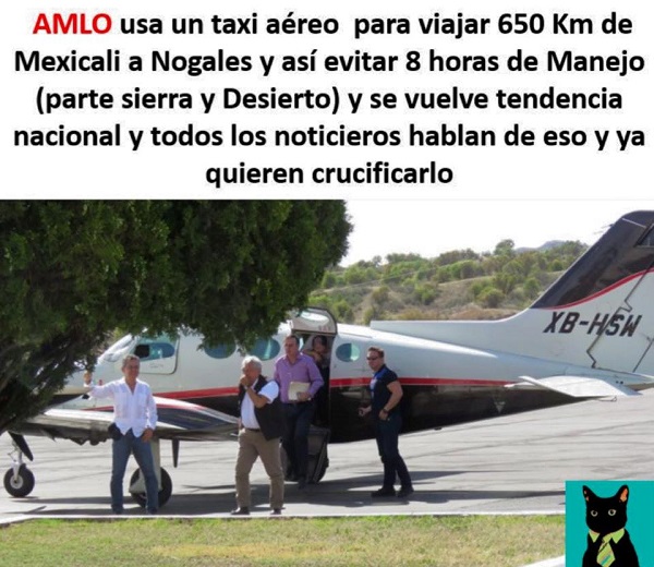 Este lunes, Andrés Manuel López Obrador ocupó un avión privado como parte de su gira proselitista en San Luis Río Colorado, pese a que ha dicho reiteradamente que está en contra de los transportes privados e incluso, de llegar a la presidencia, vendería el avión presidencial.