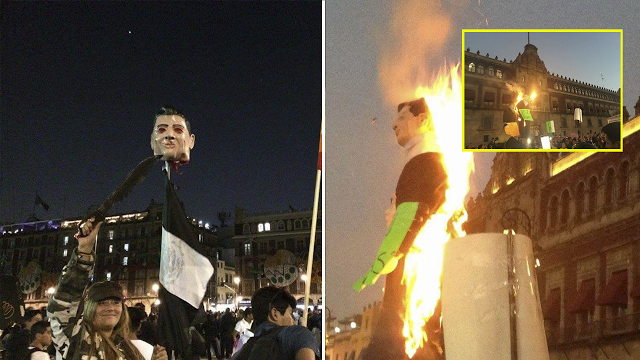 Una vez llegado a las afueras del Palacio Nacional, los manifestantes prendieron fuego y le cortaron la cabeza a una figura de Enrique Peña Nieto.
