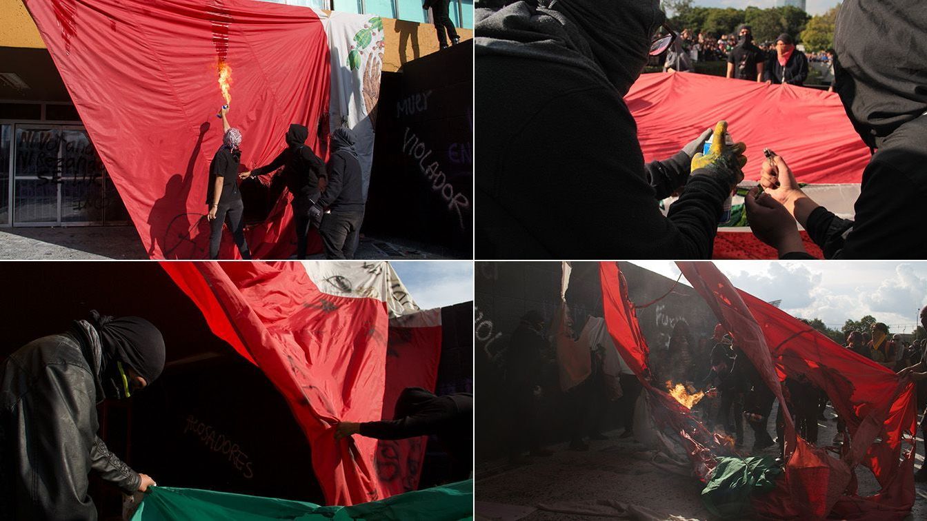 Luego de la marcha a la Torre de Rectoría, jóvenes encapuchados rompieron vidrios y quemaron la Bandera que se encuentra en el asta de dicho sitio en Ciudad Universitaria.