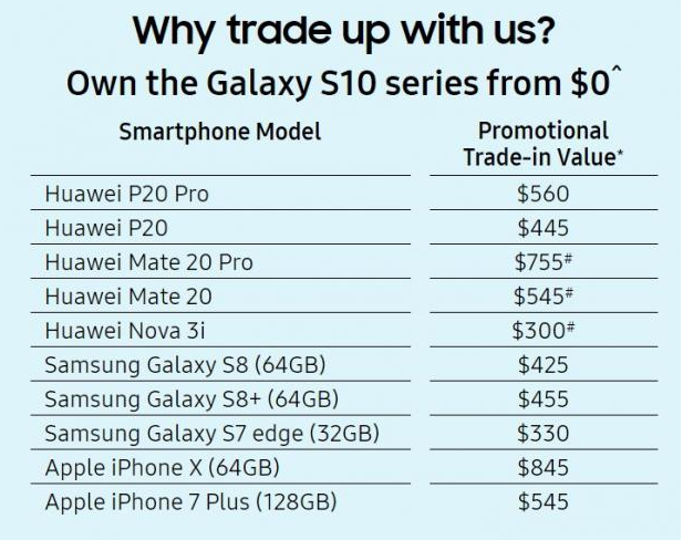 La iniciativa fue lanzada en Singapur, donde los usuarios de un Huawei P20, P20 Pro, Mate 20, Mate 20 Pro o Nova 3i pueden llevar sus teléfonos con un proveedor autorizado y recibir a cambio un cupón cierta cantidad de dinero que pueden utilizar para adquirir uno de los modelos del insignia más reciente de la firma surcoreana.