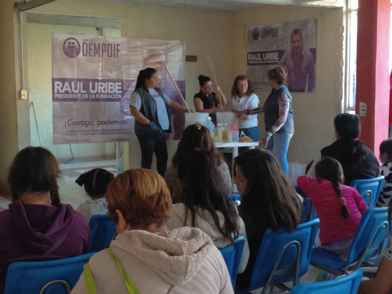 La Fundación DEMPOIF llevo a cabo un taller en el campo conocido como “el polvorín” que consistió en hacer sus propios artículos para la limpieza de su hogar con un muy bajo costo y de buena calidad como: deterge líquido, clarasol, jabón rosita etc.