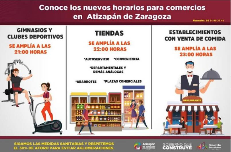 De a cuerdo al semáforo naranja vigente para el Estado de México y Respetando el 30% de aforo además del cumplimiento de todas las medidas sanitarias, se amplían horarios de servicios para apoyar a la reactivación de la economía en la demarcación.