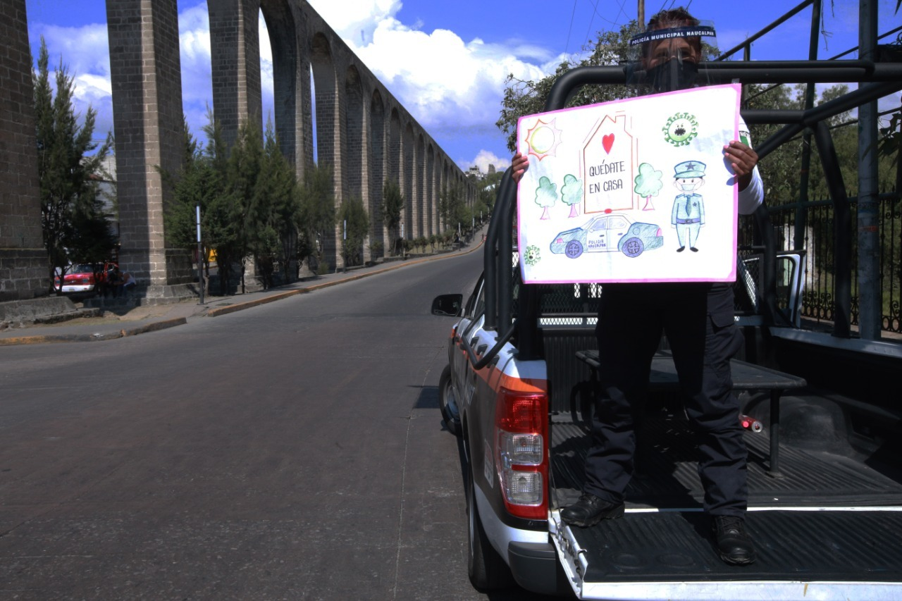 En los recorridos por las colonias, los oficiales también expusieron más de 300 dibujos realizados por hijas e hijos de elementos de Seguridad Ciudadana, quienes bajo el lema “Quédate En Casa” exhortan a la población a mantener las medidas sanitarias, mientras sus padres cuidan a los naucalpenses.