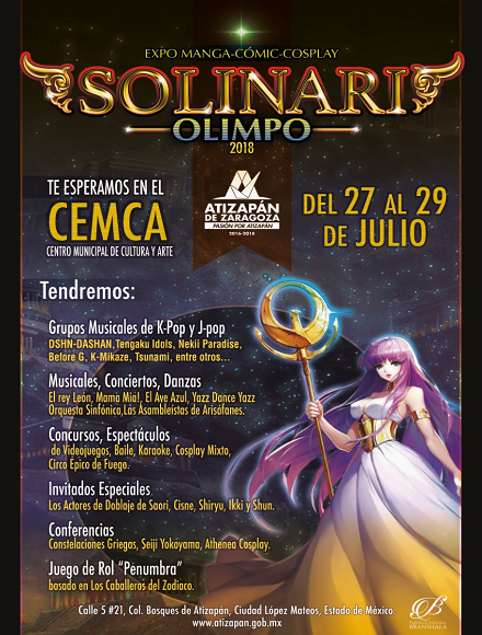 El gobierno de Atizapán de Zaragoza, a través de la dirección de Cultura Arte y Recreación, en colaboración con el grupo Cultural Brashala, realizaran durante los días 26, 27 y 28 de julio la Expo Solinari 2018, una convención de manga, anime y cosplay.