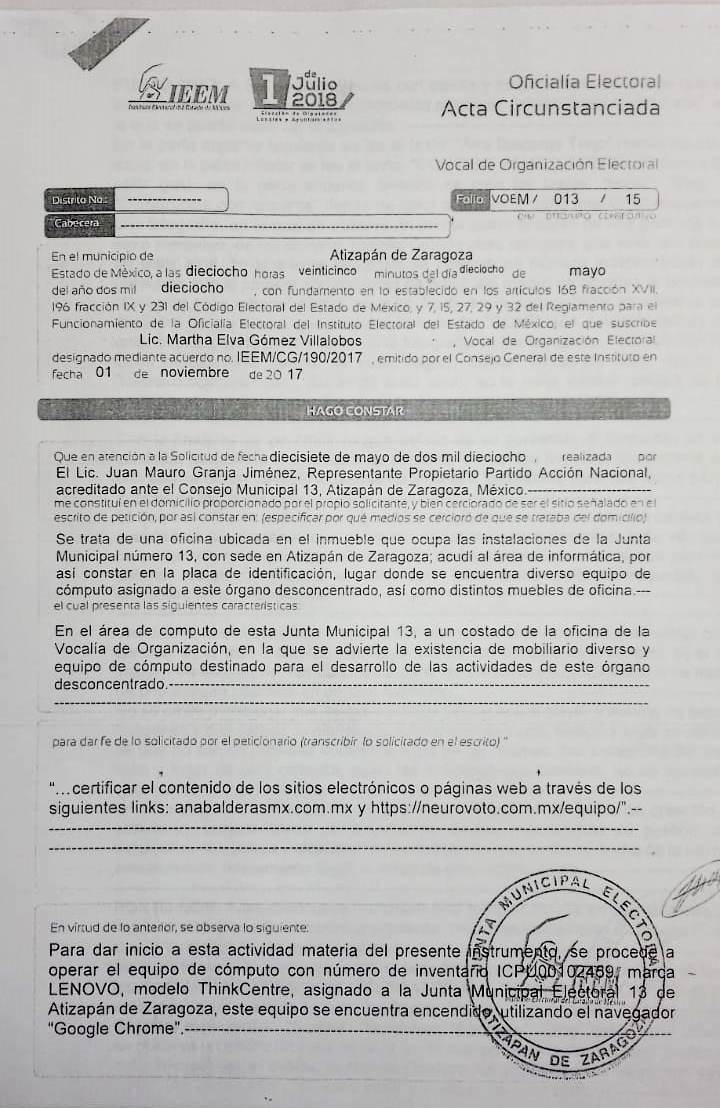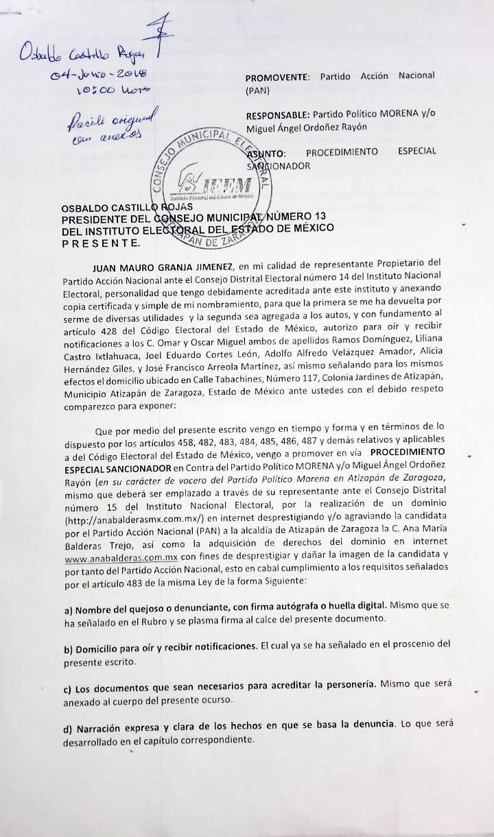 Ante esta situación, la Coalición Al Frente Por el Estado de México, informó en rueda de prensa, que ya fue levantada un acta en contra del Partido político Morena y/o Miguel Ángel Ordóñez Rayón, ante el Instituto Electoral del Estado de México (IEEM), para promover vía procedimiento especial sancionador el agravio y desprestigio del mal uso de estos dominios en contra de la candidata panista Ana Balderas Trejo.