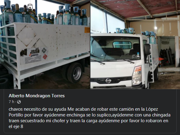 En redes Sociales tambien la victima solicito ayuda para localizar el camión que le fue robado.